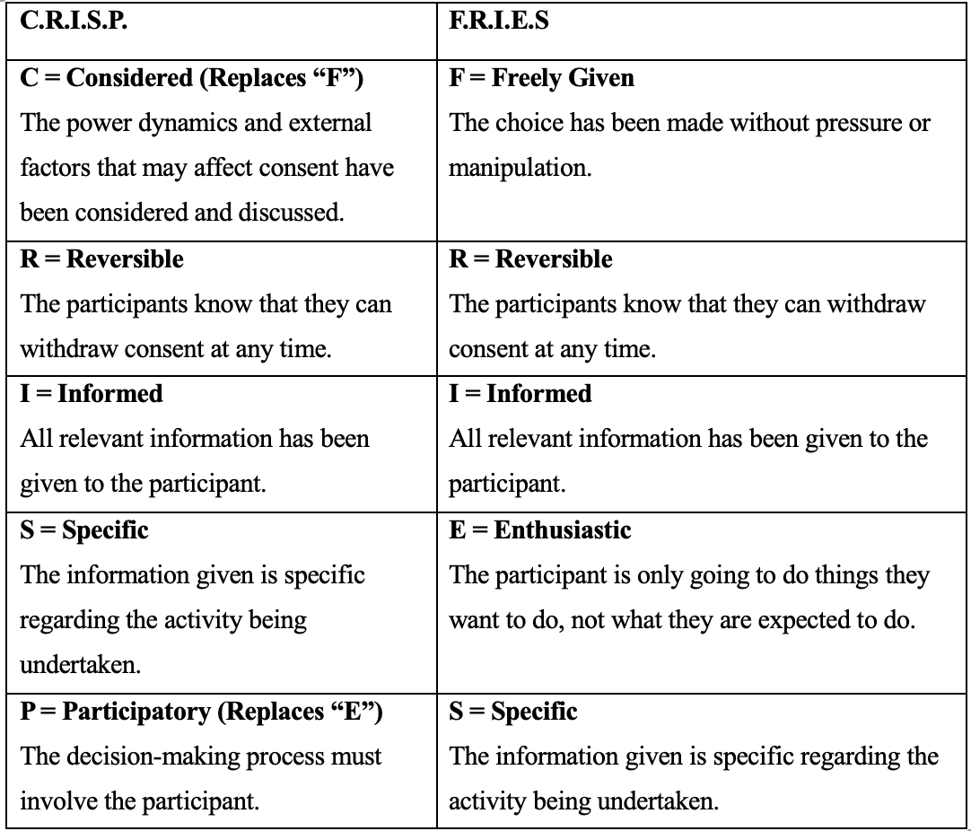 In all of the choices I make in my approach to actor training, C.R.I.S.P is at the heart of all of them. C.R.I.S.P stands for Considered, Reversible, Informed, Specific and Participatory. This acronym created by Intimacy Directors and Coordinators (Intimacy Directors and Coordinators 2023) is a performance-specific version of Planned Parenthood’s F.R.I.E.S acronym (Planned Parenthood 2023). The table below names and compares the two.