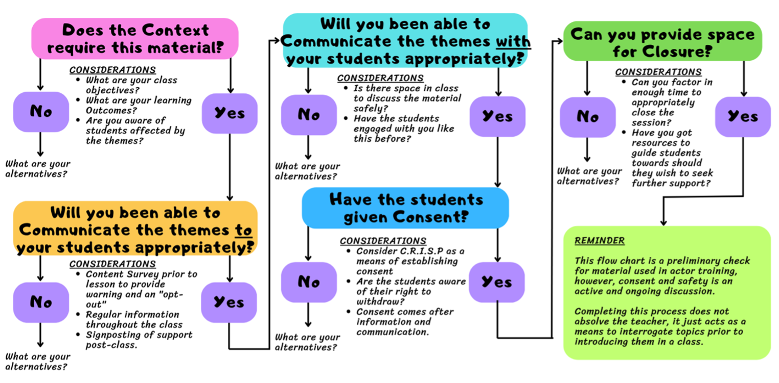 “Figure 1 is a flow chart I created to ensure I can respect the boundaries of my students. This was inspired by my... research into Trauma-informed pedagogy, as a means of “actively resist[ing] re-traumatisation” (Columbia University 2023). It is designed to function as a Consent-focused, re-traumatisation prevention method. ...The following is an example of how I have actively engaged with the flow chart. ”